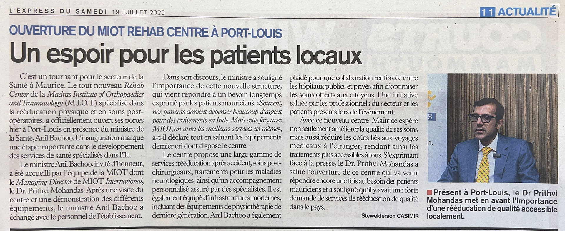 An exclusive interview by TOP FM Mauritius with Dr.Prithvi Mohandas, Managing Director of MIOT International, on the launch of the MIOT Rehab Centre in Mauritius.