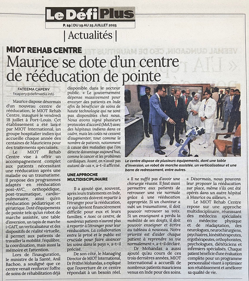 MIOT International, India, launched its state-of-the-art “MIOT Rehab Centre” in the Mauritius on 18th July 2025. The opening was officiated by the Hon’ble Minister of Health and Wellness of Mauritius, Mr. Anil Kumar Bachoo. This marks an important milestone in strengthening the relationship between MIOT International and Mauritius.
